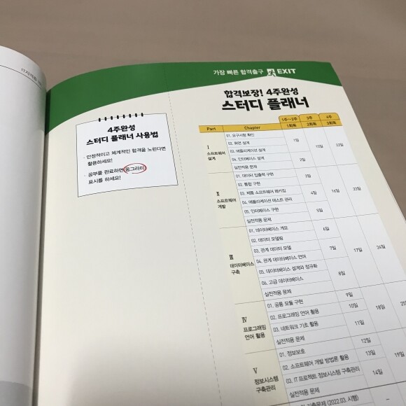 정보처리기사 필기 교재의 가장 큰 장점 중 하나라고도 말할 수 있는데요. 4주 완성 학습 플래너를 제공해준다는거에요! 4주만에 개념과 문제를 완벽하게 마스터할 수 있는 계획서! 너무 괜찮지 않나요? 제가 에듀윌 교재를 믿고 사용하는 이유라고 말해도 과언이 아니에요! 규칙적으로 공부할 수 있도록 학습 플래너를 제공해주기에 확실하게 시험 준비를 할 수 있어서 좋았어요!