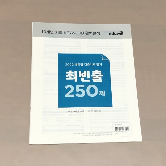 또한, 이번 건축기사 교재의 장점 중 하나가 최빈출 250제 부록이 수록되어 있다는 점이에요. 건축기사 필기시험은 문제은행식으로 출제된다고 하기에 자주 출제되는 문제가 반복되어 출제된다고 합니다. 최빈출 부록은 과목별로 자주 출제되는 문제를 50문항씩 선별하여 수록되어 있고, 휴대하기 좋은 사이즈로 자투리 시간을 활용해 공부할 수 있어서 유용하게 사용하실 수 있으세요.