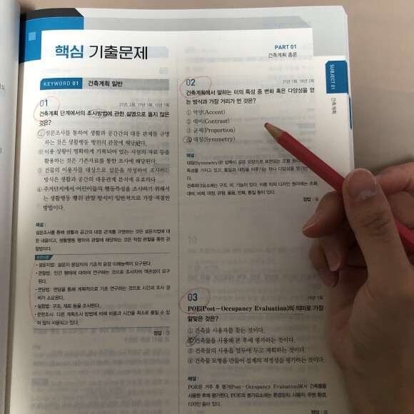 암기 위주 과목(건축계획&건축 관계 법규)을 공부하는 1권, 이해 위주 과목(건축시공&건축구조&건축설비)을 공부할 수 있는 2권, 마지막으로 기출문제 편(최신 5개년 기출 수록)까지 완벽하게 공부할 수 있도록 구성되어 있어요.