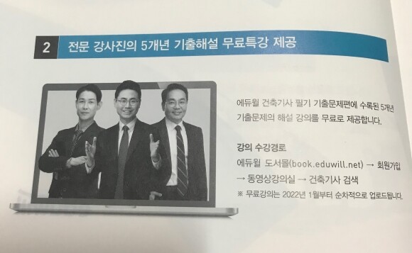 에듀윌 건축기사 필기 책이 제공하는 혜택들인데요. 5개년 기출문제 무료 특강을 제공해 주고 있어서 시험공부 하는데 가장 마음에 들더라고요.