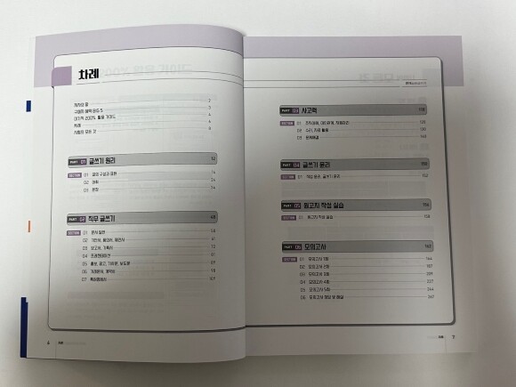 이기적 한국 실용글쓰기 교재는 6개의 파트로 구성되어 있어요. 이 책은 시험 관련된 안내가 먼저 소개되어 있고 그 뒤로, 글쓰기의 원리, 직무 글쓰기, 사고력, 글쓰기 윤리, 원고지 작성 실습, 마지막으로는 모의고사 5회분으로 구성되어 있어요.