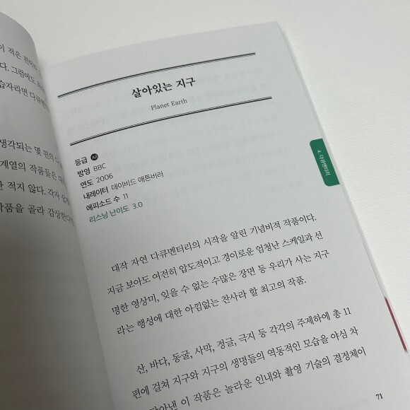 4장과 5장에서는 다큐멘터리와 애니메이션 주제로 다뤄주고 있어요. 다큐멘터리가 영어 초보자가 공부하기에 딱 적합하다고 하더라고요. 그중 살아있는 지구라는 다큐멘터리가 리스닝 난이도도 3.0으로 괜찮다고 해요. 또한, 아프리카, 코스모스, 일곱 개의 대륙 하나의 지구 등 다양한 다큐멘터리에 대해 소개해 주고 있어요. 5장에서는 애니메이션 업, 스파이더맨, 코코, 주토피아, 겨울 왕국, 인사이드 아웃, 인크레더블 등 다양한 작품에 대해 담겨 있어요. 업과 주토피아, 인사이드 아웃 등 제가 좋아하는 애니메이션이 많아 리스닝 난이도와 콘텐츠를 소개해 주고 있어요.