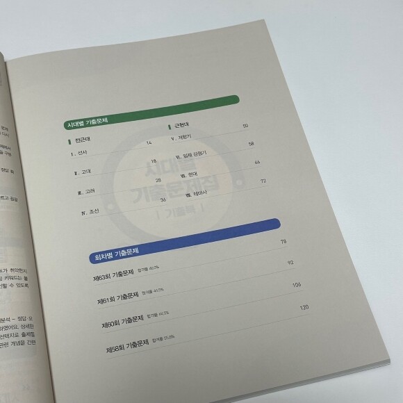 두 권으로 나눠 공부할 수 있다는 점도 메리트 있었어요. 그리고 1권 에듀윌 한국사 기출북에는 시대별로 기출문제로 구성되어 있고, 63회, 61회, 60회, 58회 회차별 기출문제로 4회분 추가로 구성되어 있어요.