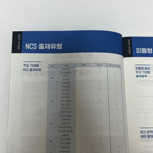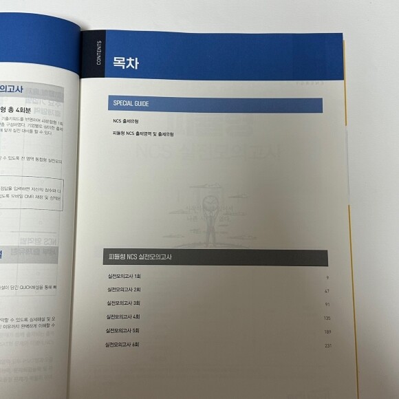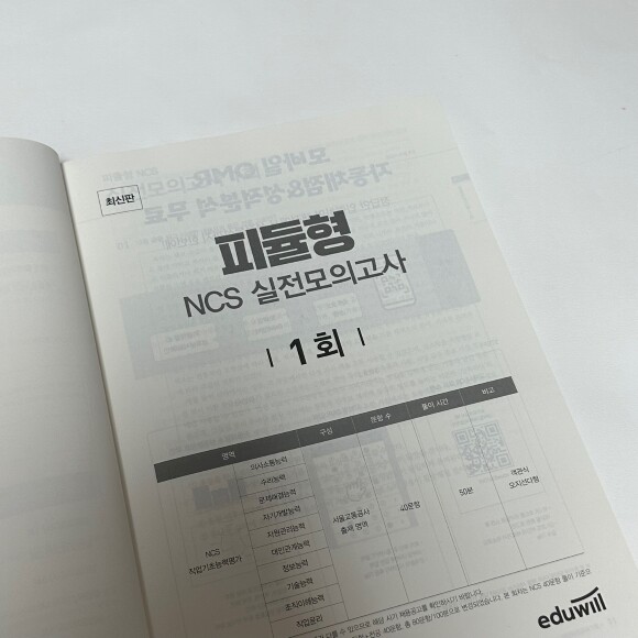 이 책은 시간을 재며 실전처럼 연습하며 문제를 풀 수 있어 시험준비하기 제격이라 할 수 있어요. 이번 에듀윌 책에서는 최신 출제 경향이 반영되어 있고, 40문항형/50문항형/60문항형 총 4회분과 전 영역 통합형 2회분으로 NCS 10개 영역의 피듈형 문제를 모두 학습할 수 있도록 전 영역 통합형 실전모의고사로 구성되어 있어요.