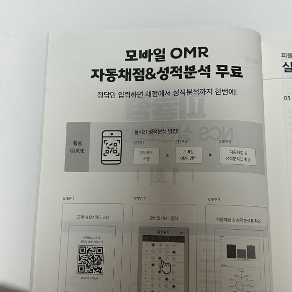 그리고 에듀윌 NCS 책에서는 회차당 수록되어 있는 QR코드를 접속하면 정답을 입력하고, 자신의 점수와 다른 수험생들과의 비교 데이터를 확인할 수 있는 모바일 OMR 채점 및 성적분석 서비스가 제공되어 있고, 실전 시험처럼 연습할 수 있도록 NCS 피듈형 모의고사 OMR카드가 별도로 수록되어 있어 최종적으로 시험 마무리 하실 때 사용하시면 좋으실거라 생각이 듭니다.