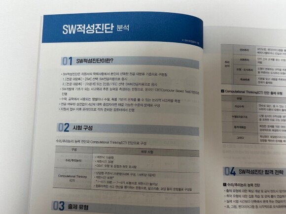 파트 3에서는 온라인으로 실전 대비를 할 수 있는 기출 변형 1회분과 실전 모의고사 2회분이 수록되어 있어요. SW 적성진단 기출 경향이 완벽하게 반영되어 있어 실전과 비슷한 난이도의 문제를 풀어볼 수 있어요그리고 이 부분은 온라인으로 모의고사를 응시할 수 있어 충분하게 실전 시험처럼 대비를 할 수 있어요.
