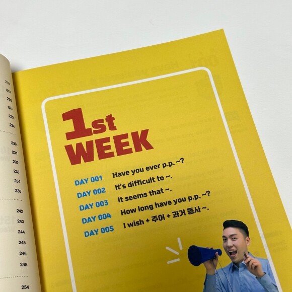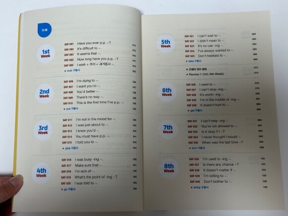 『액팅글리시 곤쌤의 스피킹 치트키』 책은 저자가 미국에 살며 가장 많이 사용하며 말한 패턴 100개와 구동사 100개를 집중적으로 학습해 기본적인 영어 표현을 익힐 수 있어요. 먼저 1주차 DAY 01 - 05까지 책의 구성이 어떤지 살펴보도록 할게요.