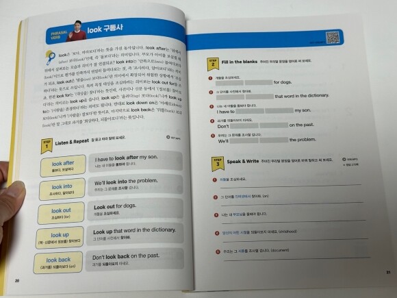 마지막 파트인데요. 마지막 파트는 구동사를 익힐 수 있도록 look, put, keep 등 기본 동사 20개에서 회화에 꼭 필요한 핵심 구동사 5개씩 뽑아서 확실하게 익힐 수 있어서 유용하세요. 게다가 동사와 전치사/부사의 의미를 연결해 구동사의 뜻을 쉽게 이해할 수 있도록 풀어 설명되어 있고, 회화에서 가장 많이 사용되는 구동사의 핵심 의미 5개를 예문과 함께 익힐 수 있어 도움이 많이 되었어요. 또한, 앞에서 배운 구동사를 제대로 익혔는지 확인하는 연습문제와 구동사를 응용해 말해보는 훈련 등 다양한 문제까지 제공되서 확실하게 구동사 부분을 익혔는지 공부할 수 있어 좋았어요.