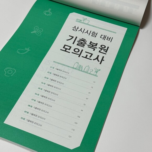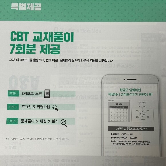 최신 출제기준과 개정법규 반영한 빈출 족보이론이 수록되어 있고 출제경향 파악 및 실전을 완벽하게 대비할 수 있도록 기출복원 모의고사를 10회분이나 수록되어 있어 조리기능사 자격증 취득하기 거뜬없다는 생각이 들었어요. 또한, 가장 좋았던 혜택 중 하나가 CBT 교재풀이 7회분을 제공해준다는 점인데 교재 내 QR코드를 활용하여, 쉽고 빠르게 문제풀이며 채점, 분석까지 해주고 있어 조리기능사 자격증은 에듀윌 조리기능사 필기 교재 한 권으로 공부하면 딱일 듯 싶었어요.