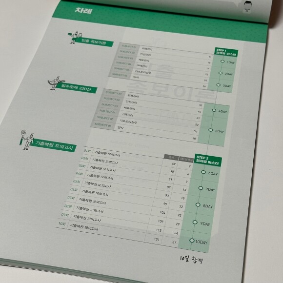 에듀윌 조리기능사 필기 문제집은 3개의 큰 파트로 구성되어 있어요. 빈출 족보이론 / 필수문제 220선 / 기출복원 모의고사 3파트로 구성되어 있고 단기간에 끝낼 수 있도록 10일 학습계획서까지 있어 유용해요.