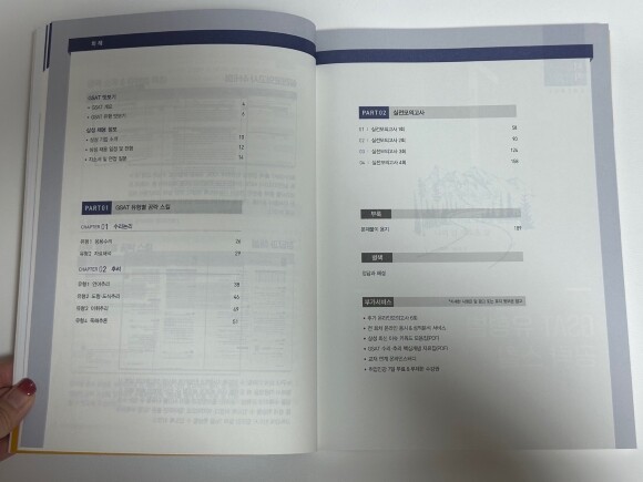 에듀윌 GSAT 책 목차를 살펴볼게요. 에듀윌 GSAT 문제집은 2개의 파트로 나눠져 있어요. 이 책은 GSAT 유형별 공략 스킬(수리논리/추리), 실전 모의고사(4회분)으로 구성되어 있어요.