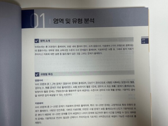 먼저 GSAT 유형별 공략 스킬 파트에요. 이 파트에는 2가지 영역인 수리논리/추리영역의 유형별 특징이 수록되어 있어요. 먼저 영역 및 유형 분석이 되어 있어 유형별 특징을 파악할 수 있어요. 또한, 출제 유형을 20가지로 세분화 및 세부 유형별 공략 스킬이 수록되어 있어 GSAT에 출제되는 모든 유형을 전략적으로 풀이할 수 있도록 되어 있어요. 또한, 예제를 통해 시험 유형을 익힐 수 있어서 더없이 좋았답니다.