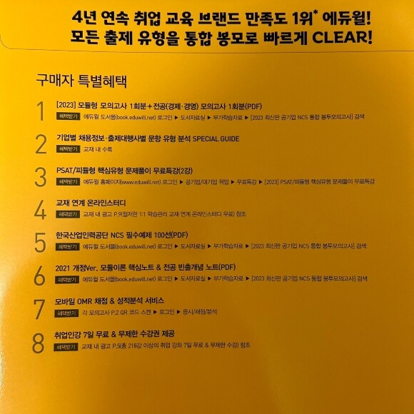 에듀윌 NCS 문제집은 독학으로 준비하기 적합한 문제집 중 하나인데요. 실전 시험처럼 대비하기 좋은 교재 구성과 이와 동시에 다양한 혜택까지 제공해준다고 하니 시험대비로 완벽한 NCS 교재 아닌가 싶어요. NCS 교재 추천 드리는 첫번째 이유가 다양한 혜택을 갖고 있다는건데요. 먼저 에듀윌 NCS 교재 혜택에 대해 알아볼게요.