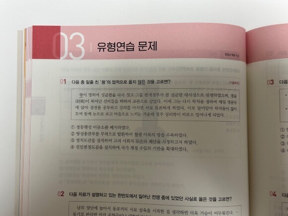 다음으로는 유형 연습문제로 앞에 나온 부분과 사뭇 다른 걸 확인할 수 있어요. 다양한 유형으로 구성되어 있고 기출 복원 문제로 구성되어 있어 한국사 시험 유형을 익히기에 유용해요.