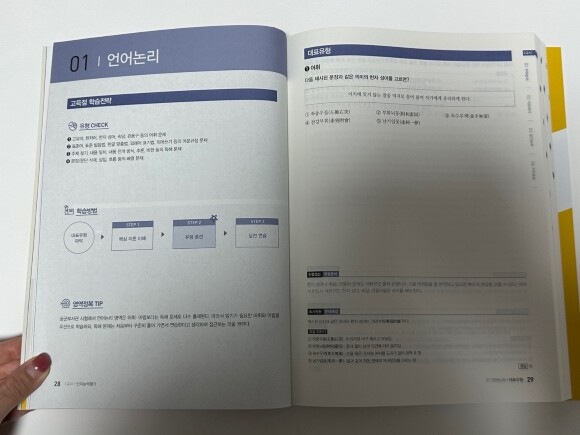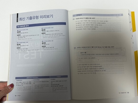 일단 이 페이지를 보시면 최신 경향 분석이 되어있는데요. 언어 논리력은 15분 동안 20문항을 풀어야 되세요. 그리고 이 페이지에서는 대표 유형을 소개해 주고 있어요.