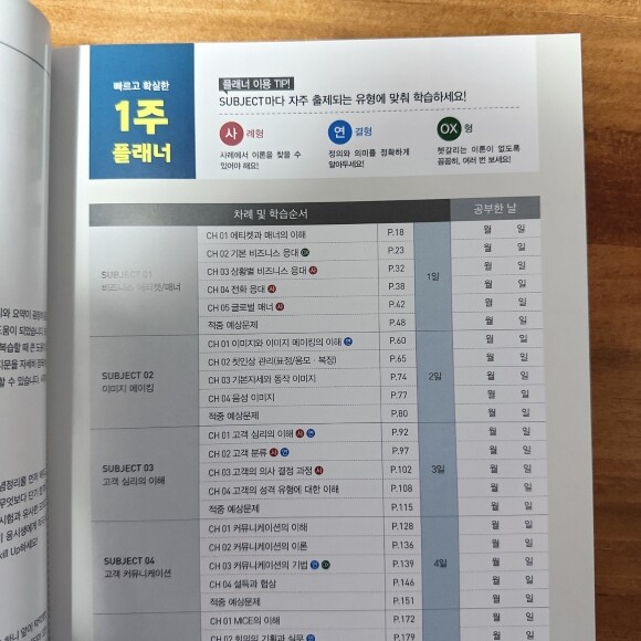 에듀윌 SMAT 책에서도 학습 플래너를 제공해 주고 있어요. 단기간에 학습하고 시험을 볼 수 있도록 1주/2주 학습 플래너를 제공해 주고 있어요. 저 같은 경우 1주 학습 플래너로 공부하고 있어요. 급작스럽게 마케팅 부분을 업무처리하게 되었는데 기초적은 부분을 빠르게 습득하기 위해 1주 학습 플래너로 공부하게 되었어요. 생각보다 1주 안에 공부할 수 있어서 괜찮더라고요! 또한, 제가 계획을 세우지 않고 공부할 수 있어서 공부하는데 시간 단축할 수 있어서 좋았어요.