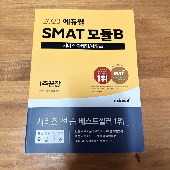단기간에 독학으로 준비하기 좋은 에듀윌 SMAT 모듈 B 교재! 이 교재로 서비스 마케팅/세일즈 1주 안에 끝내고 모듈 B 자격증 취득하실 수 있으실 거예요. SMAT 시험이 12월 10일인데 8일 만에 에듀윌 1주 플래너로 SMAT 모듈 B 확실하게 공부하시고 시험 보시는 건 어떨까 싶어요. 에듀윌 SMAT 교재 추천드립니다!