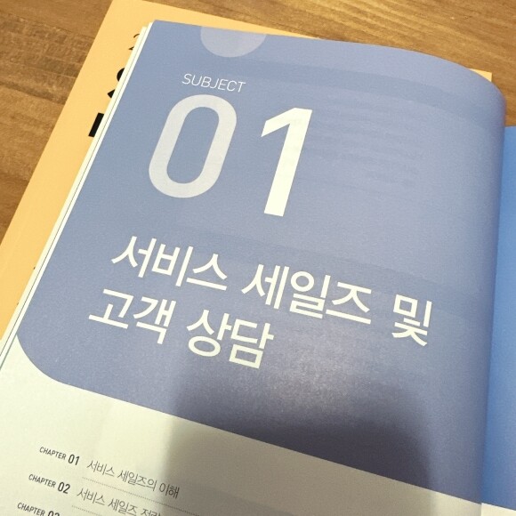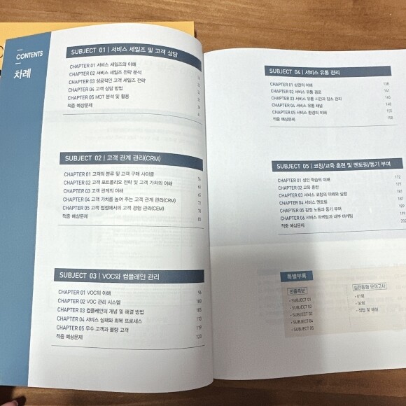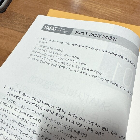 에듀윌 SMAT 교재는 5개의 파트로 나눠져 있어요. 서비스 세일즈 및 고객 상담, 고객 관계 관리(CRM), VOC와 컴플레인 관리, 서비스 유통 관리, 코칭/교육 훈련 및 멘토링/동기 부여로 이루어져 있어요.