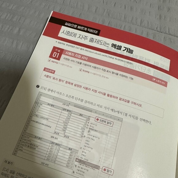 가장 좋았던 부분 중 하나였는데요. 시험에 자주 출제되는 엑셀의 필수 기능들이 꼼꼼하게 정리되어 있어 기초적인 부분을 모르더라도 이 부록 책 하나면 확실하게 알고 넘어갈 수 있어서 좋았어요. 또한, 엑셀의 필수 기능들을 실습을 통해 빠르게 이해할 수 있다는 점까지 완벽했어요!