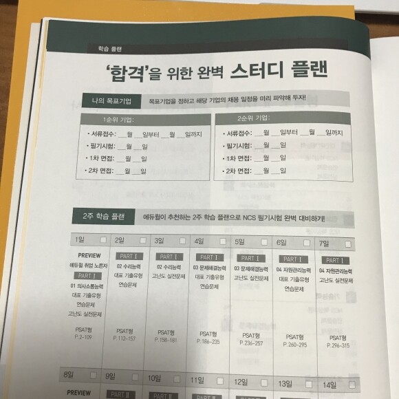 에듀윌 NCS 기본서는 스터디 플랜을 제공해 주는데요기업별로 채용 정보가 수록되어 있어서 도움이 많이 되었는데 스터디 플랜까지 제공해 주다니 정말 혜자스럽지 않나 싶어요목표 기업을 선정해 2주 학습플랜과 4주 학습 플랜 중 하나를 선택해서 준비하시면 NCS 필기시험을 완벽하게 대비할 수 있을 거라는 생각이 들었어요!