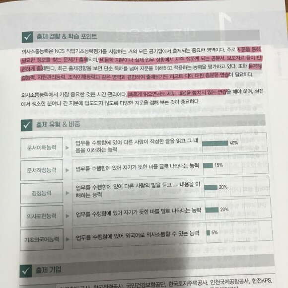 문서 이해 능력문서작성 능력경청능력의사 표현능력기초 외국어 능력 출제 유형에 대해 담아내고 있어요 이 부분은 영역별 출제 경향과 학습 포인트가 수록되어 있어 꼭체크하시고 포인트를 짚고 공부하시면 도움이 많이 되실 거예요부족한 부분이 있으면 유형별 찾아 공부할 수 있어 그 점까지도 유용했어요.