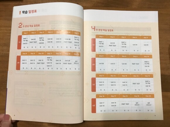 에듀윌 토익 LC 교재도 체계적인 2주/4주 학습 일정표를 제공해 주고 있는데요. 따로 계획을 세우지 않아도 돼서 시간적으로 여유도 생기고 깔끔한 학습 일정표가 정말 괜찮더라고요. 그래서 저도 4주 완성 학습 일정표로 공부하고 있어요. 2주 완성 학습 일정표로 공부하고 싶지만 저 같은 경우 일과 병행하고 있어 천천히 4주 일정표로 학습하고 있어요. 저와 같이 직장과 공부를 병행하시거나 기초부터 탄탄하게 공부하시고 싶으신 분들께서는 4주 계획표를, 시험 점수가 급하게 필요하신 분들께서는 2주 계획표로 공부하시면 좋으실 것 같아요.