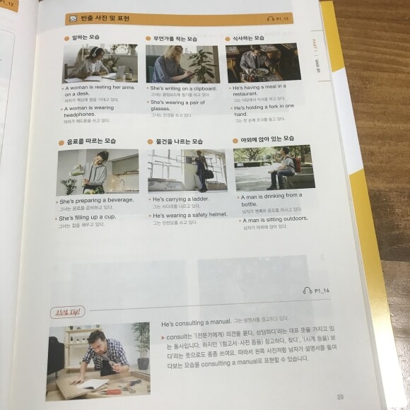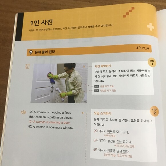1인 사진 유형의 문제 풀이 전략을 설명해 주고 있는데요. RC와 마찬가지로 단계별로 문제 풀이 과정을 제시해 주고 있어서 공부하면서 유익했어요. 이 부분은 토익 리스닝에 가장 자주 출제되는 문제 유형을 선별하여 단계별 풀이 과정을 제시했어요. 문제 풀이를 어디서 어떻게 접근해야 하는지를 세세하게 설명해 주고 풀이 과정이 잘 되어 있어 공부하는 데 도움이 많이 되세요.