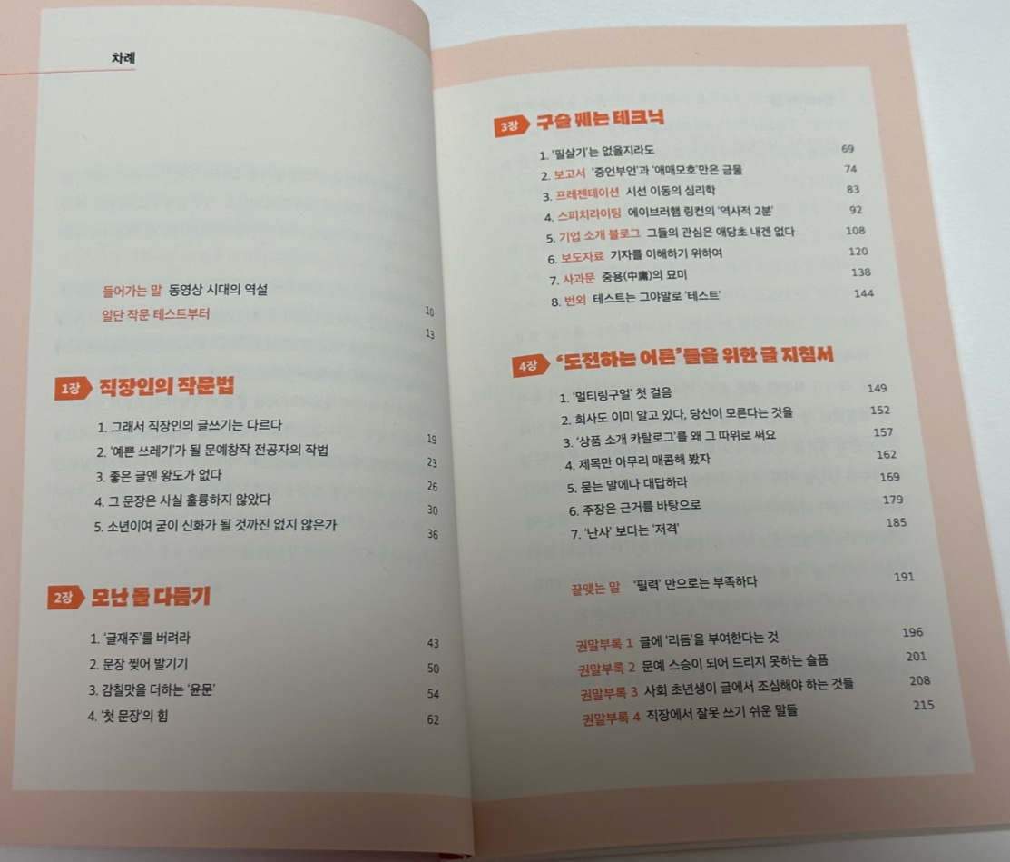 PART 3에서는 필살기는 없더라도 글을 잘 쓰는 테크닉에 대해 잘 설명되어 있습니다. 또한, 보고서에 쓰이면 안되는 표현들이나, 스피치라이팅, 사과문 쓰는 방법등에 대해 잘 설명되어 있어 회사에서 보고서 쓰는데 도움을 많이 받았습니다. 직장인의 글쓰기는 명확한 의미 전달이 가장 중요한데 이번 파트에서는 어떻게하면 명확하게 전달할 수 있는지 그리고 작문의 다양한 테크닉들에 대해 다루고 있어 도움이 많이 되었습니다. 마지막 PART 4는 일하는 어른들을 위한 글 지침서가 정리되어 있습니다.