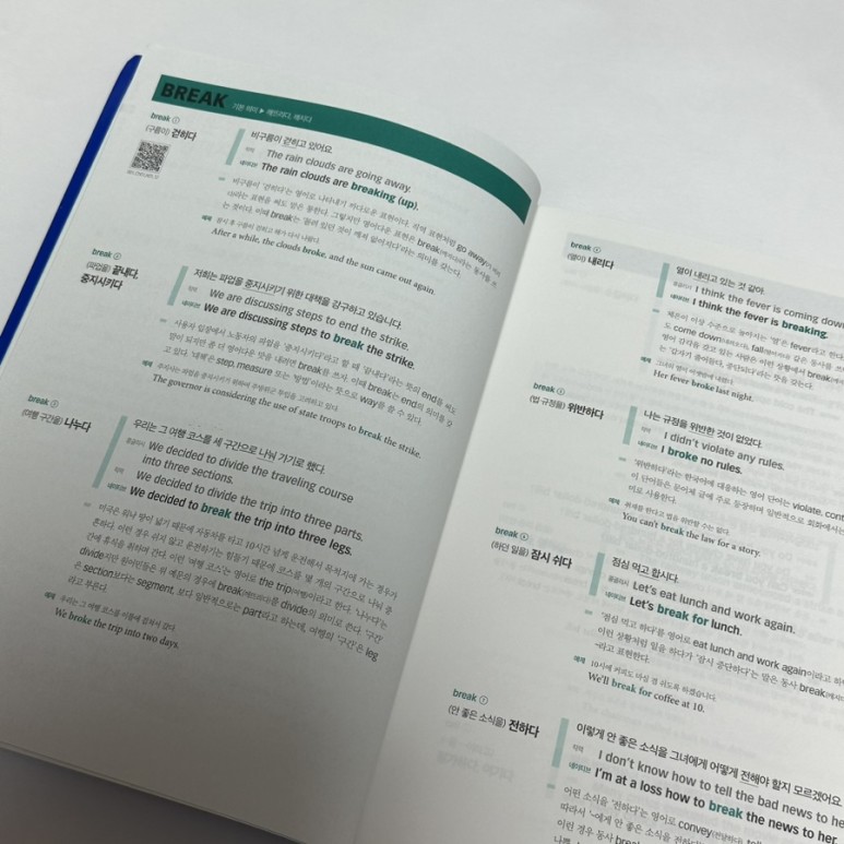Chapter 1 첫번째 동사로 break를 꼼꼼하게 정리되어 있습니다. break 기본 의미부터, 많이 쓰이는 의미까지 총 9개가 정리되어 있습니다.