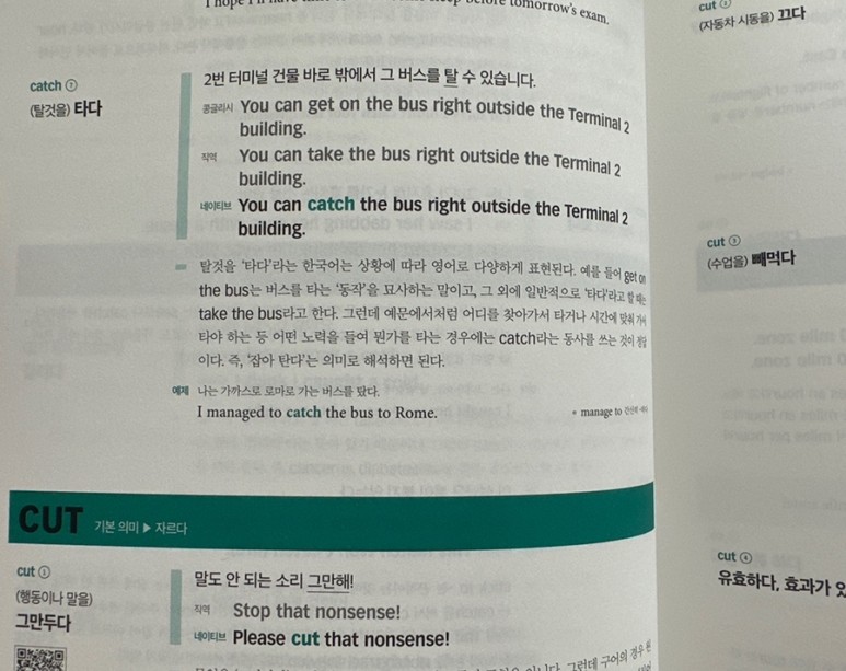교재에서는 직역과 네이티브가 쓰는 표현, 콩글리시 표현까지 모두 예문을 통해 보여주고 있습니다.
