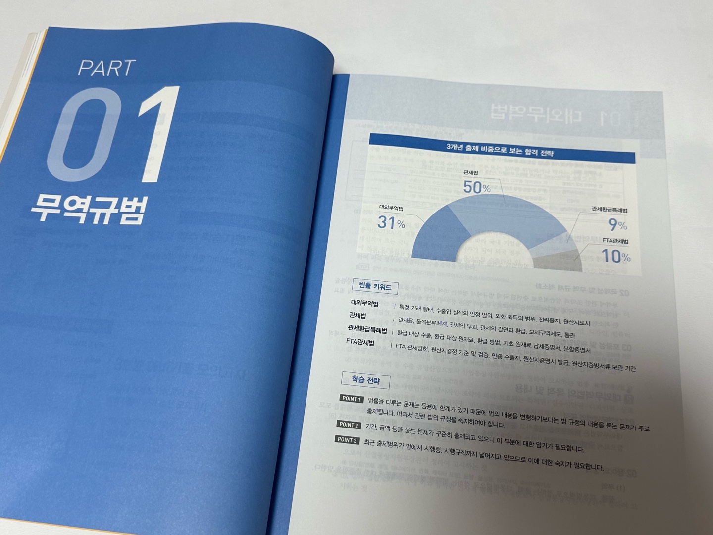 에듀윌 국제무역사 책은 파트 별 앞 페이지에 3개년 출제 비중으로 보는 합격 전략과 빈출 키워드, 학습 전략이 잘 설명되어 있습니다. 그래서 가장 중요한 부분을 확실하게 파악할 수 있었으며, 학습 전략대로 공부하면 비전공자들도 한번에 무역규범에 대해 이해하고 넘어갈 수 있었습니다. 이 부분을 유용하게 활용하셔서 시험보시는데 도움을 받으셨으면 합니다. 저 같은 경우 항상 출제 경향을 파악 후 공부하고 있는데 이런식으로 공부하면 처음 공부해도 바로 이해하고 넘어갈 수 있어서 좋았습니다.