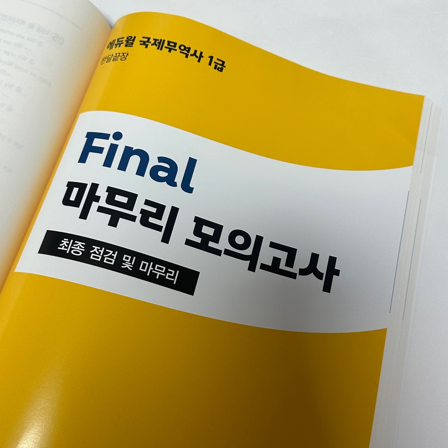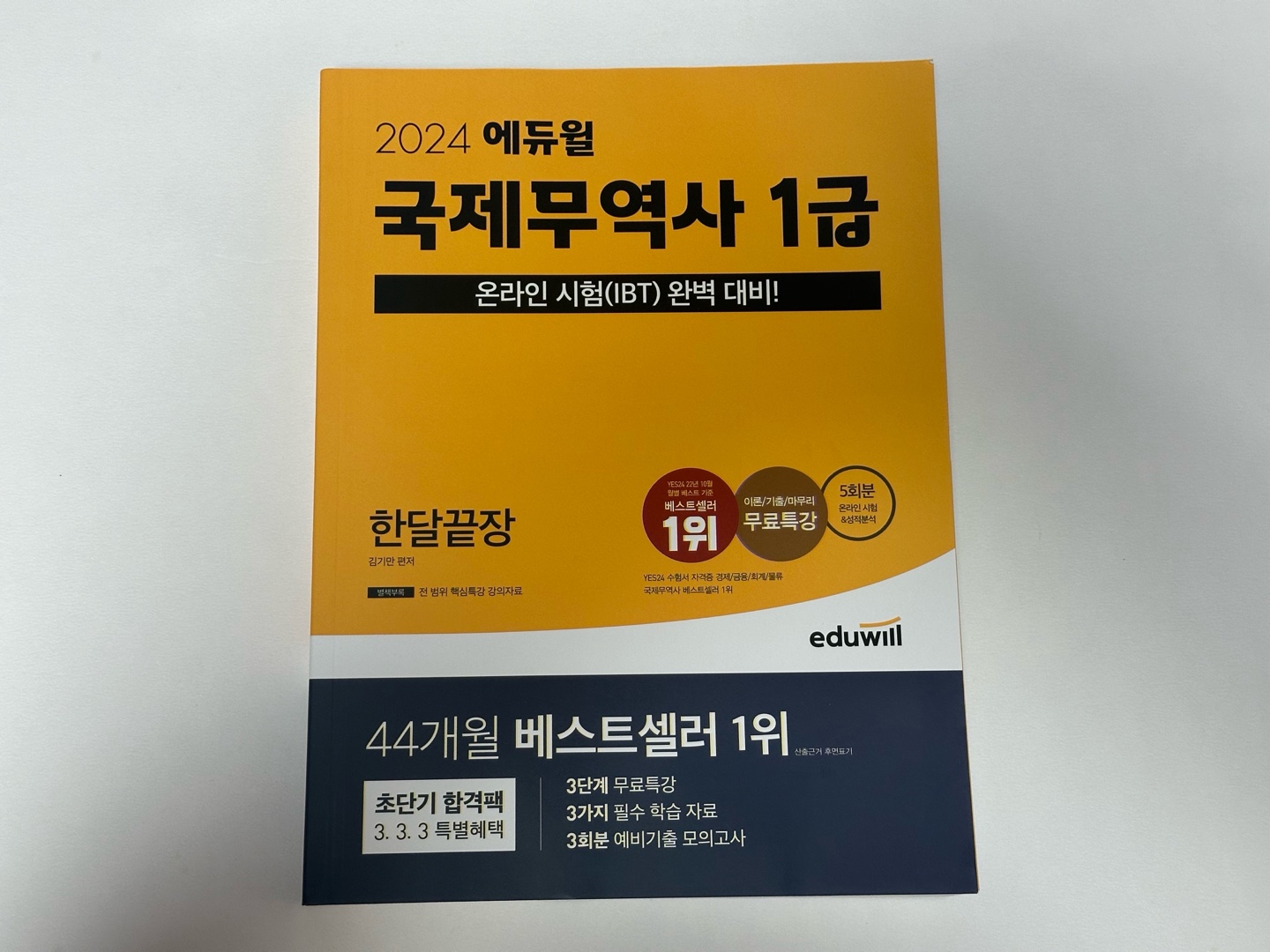 그리고, 모의고사가 3회분이나 수록되어 있어 실전이라 생각하며 문제를 풀 수 있어 시험대비로 유용했으며, 전 범위 핵심 특강 자료로 휴대하며 공부할 수 있다는 점이 정말 좋았습니다. 비전공자들도 에듀윌 국제무역사 1급 교재 한 권이면 시험 대비로 완벽할 정도로 구성이 체계적이었습니다. 다양한 혜택이 많이 제공되기는 에듀윌 국제무역사 1급 교재로 공부하면 좋은 성적 받을 수 있을 것 같아 에듀윌 교재 추천드립니다!