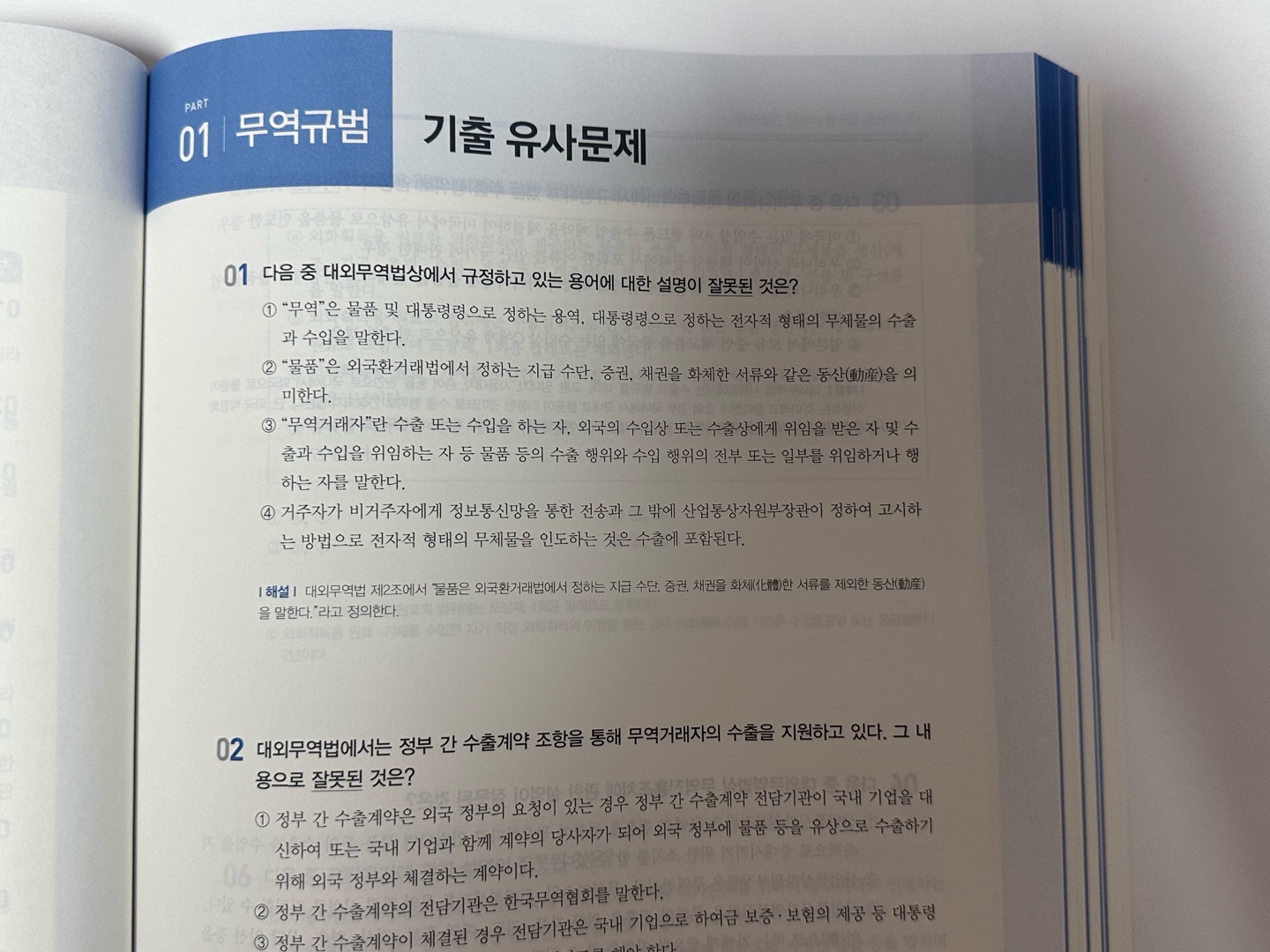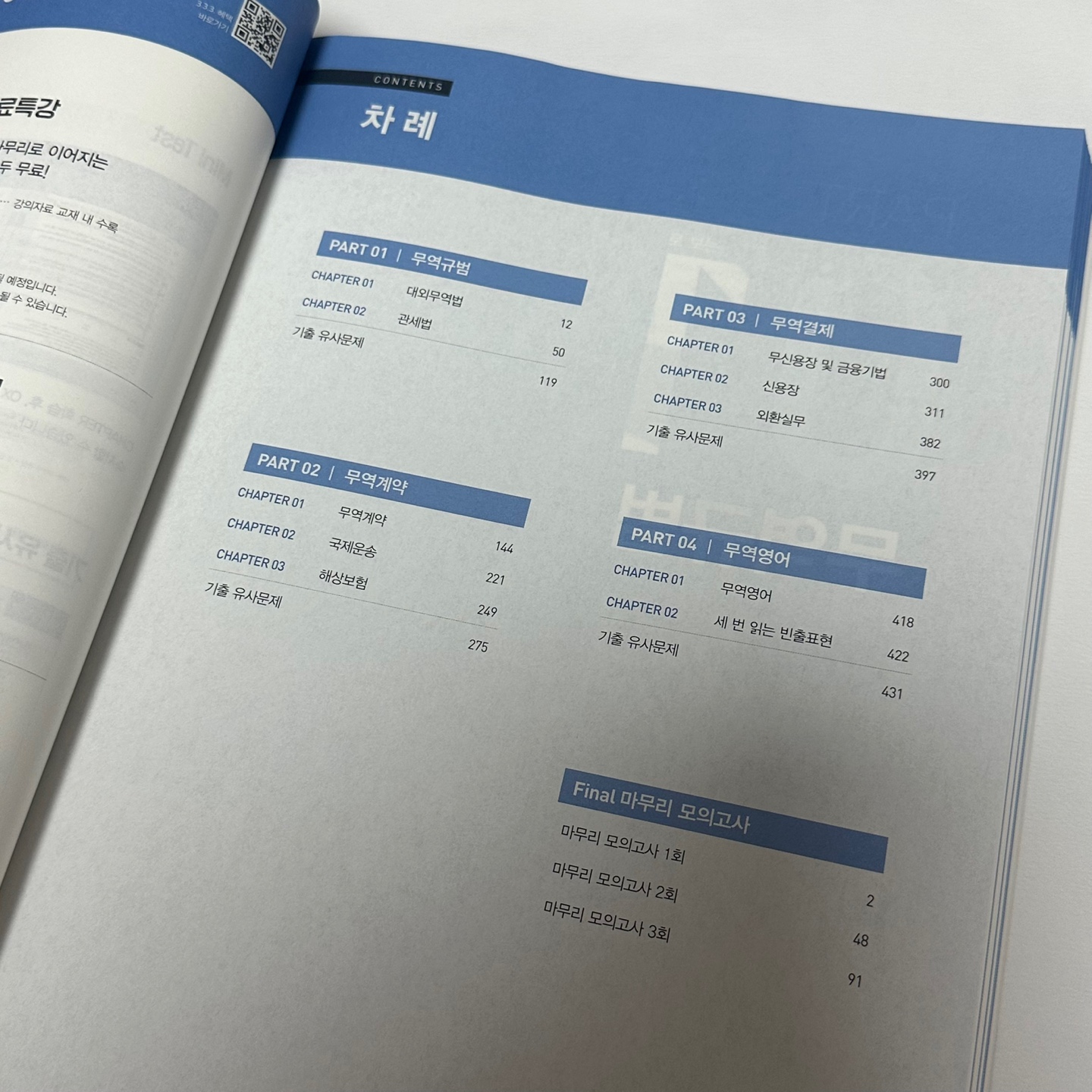 에듀윌 국제무역사 1급 교재는 4개의 파트와 Final 마무리 모의고사 3회분으로 구성되어 있습니다. 이 책은 무역 규범, 무역계약, 무역결제, 무역언어로 구성되어 있으며 각 파트별 기출 유사문제까지 수록되어 있어 시험 대비하기 좋았습니다. 게다가 이론 공부 후 마무리 모의고사로 시험처럼 공부할 수 있다는 점까지 완벽했습니다.