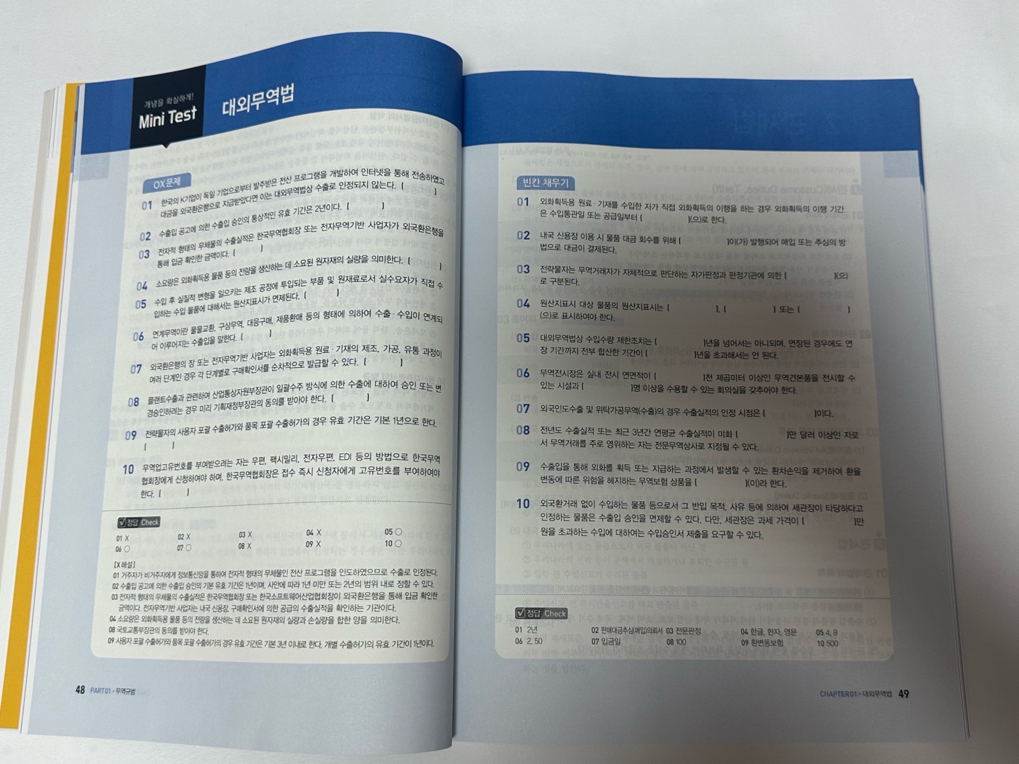게다가 chapter 학습 후 ox문제와 빈칸 채우기 문제로 개념을 확실하게 공부했는지 테스트를 볼 수 있다는 점이 가장 좋았습니다. 틀린 부분은 다시 돌아가 개념부터 익히며 공부했고, 잘 모르는 부분은 인강을 통해 용어가 익숙해질 때 까지 반복하여 학습했습니다. part가 끝나면 기출유사문제로 시험 유사문제를 익힐 수 있었고 어떻게 시험문제로 출제되는지 파악할 수 있어 좋았습니다. 또한, 기출 유사 문제로 실전감각을 키울 수 있다는 점이 가장 좋았습니다.