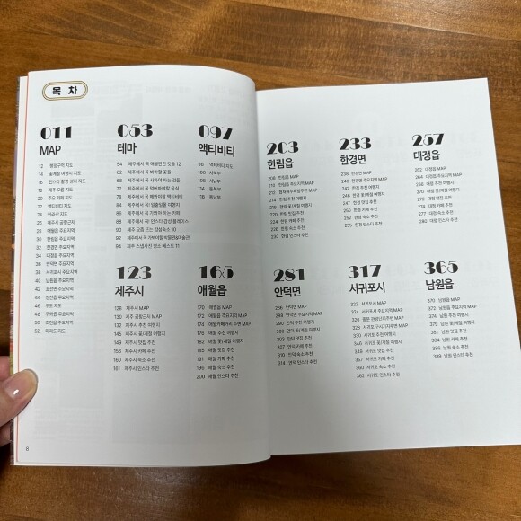 첫번째 챕터에서는 제주도 지도를 상세하게 다루고 있고, 두번째 챕터에서는 테마별로 제주도에 관련된 정보가 세세하게 담겨져 있어요. 세번째 챕터부터는 지역별로 상세한 제주도의 핫플레이스, 맛집, 숙소에 대해 정리되어 있어요.