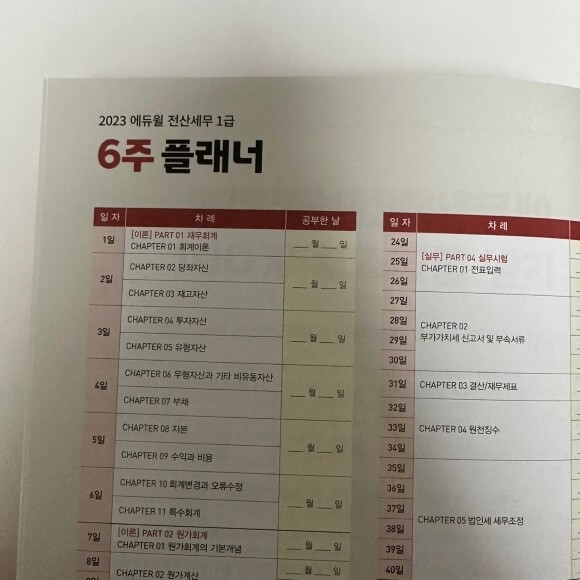 에듀윌 전산세무 교재는 전산세무 자격증 취득을 할 수 있도록 6주 플래너를 제공해주고 있어요. 플래너가 체계적으로 세워져 있어 따로 계획을 세우지 않고 공부할 수 있다는 점이 괜찮더라고요. 게다가 전산세무회계 시험 관련 안내가 꼼꼼하게 정리되어 있어 시험에 대해 확실하게 알고 넘어가실 수 있어서 유용해요. 시험 방법 및 시험 정보, 전산세무 자격증 시험 일정까지 정리되어 있어 따로 구글링하지 않아도 되서 좋았답니다.