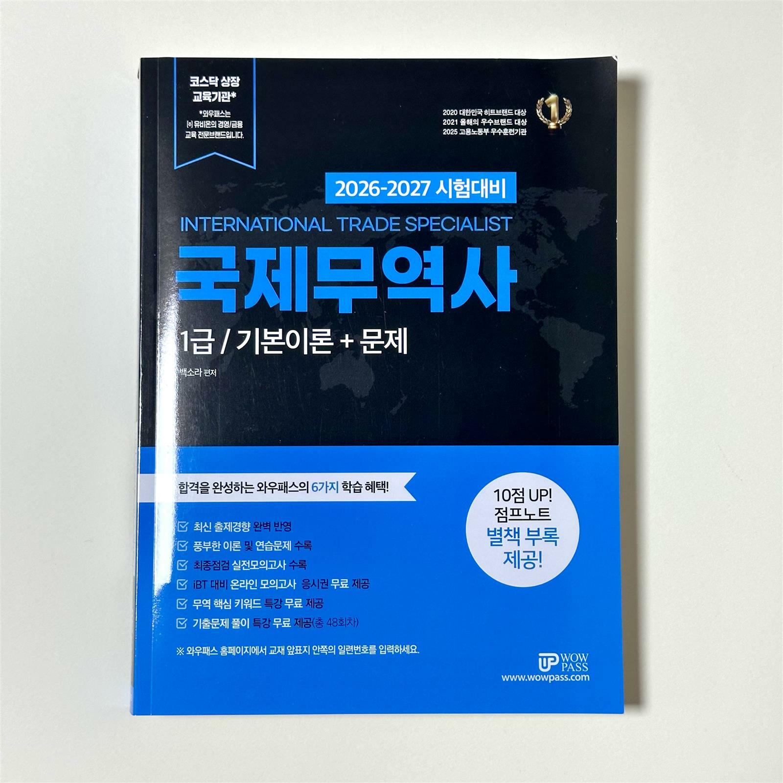 ‘와우패스로 서평단으로 교재를 제공받아 작성한 후기입니다.’ 오늘은 국제무역사 1급 시험 공부에 제격인 교재 와우패스 『국제무역사 1급』 기본이론 +문제를 소개해드리도록 하겠습니다. 와우패스 국제무역사1급 책은 체계적인 교재 구성으로 국제무역사 시험을 독학으로 준비하기 제격인 교재 중 하나인데요. 교재를 구입하기만 해도 다양한 혜택까지 제공해주기에 혼자서 국제무역사 1급 시험을 준비하기 좋답니다. 먼저 와우패스 국제무역사 1급 필기 교재 혜택에 대해 알아볼게요. ▣ 와우패스 국제무역사 책 혜택 1. [별책부록] 10점 UP! 점프노트 제공 2. 기출문제 풀이 특강 무료 제공! 3. 무역 핵심 키워드 특강 무료 제공! 와우패스 국제무역사 교재는 국제무역사1급 시험 준비를 위해 다양한 혜택을 제공해 주고 있는데요. 특별 부록으로 10점 UP! 점프노트가 제공되고 휴대하면서 갖고다니며 공부할 수 있어 좋았어요. 잘 정리되어 있어서 그런지 이 부분은 무조건 공부하려고요.게다가 기출문제 풀기 특강을 무료로 제공해주기까지 하더라고요. 틀린 문제를 특강을 통해 이해하고 넘어갈 수 있다는 점이 정말 마음에 들었습니다. 또란, 한달플래너까지 제공되어 계획을 세우지 않고 와우패스에서 제공해주는 플래너로 공부하면 시간을 더 단축시킬 수 있어 좋답니다. 와우패스 국제무역사1급 책은 4개의 파트로 나눠져 있어요. 이 책은 무역규범, 무역결제, 무역계약, 무역영어로 구성되어 있어 순서대로 공부하시면 됩니다. 국제무역사 1급 핵심 이론인데요. 핵심출제경향을 먼저 제시하고 중요한 이론들을 꼼꼼하게 정리를 하여 기본 개념 학습을 할 수 있도록 구성되어 있어요. 또한, 중요한 부분은 형광펜 표시가 되어 있어 그 부분을 중점으로 공부하시면 도움이 많이 되실거에요. 다음으로는 실전을 준비할 수 있는 연습 문제에요. 연습문제는 실전 감각 익히기에 좋아 꼭! 문제를 반복적으로 풀어보시면 좋으거라 생각합니다. 틀린 문제는 바로 아래 해설을 통해 공부하시면 바로 이해하실거에요. 다음으로는 실전 모의고사 부분이에요. 국제무역사 1급 책은 이론공부가 끝나시면 실전처럼 시험에 대비할 수 있도록 실전 모의고사가 수록되어 있어요. 시험처럼 실전에 대비하시면서 최종적으로 마무리하시면 좋으실거에요. 또한, 틀린 문제는 해설지로도 충분히 이해가 가능하니 참고하셔서 풀이를 보시면 되세요. 여기까지 와우패스 국제무역사 1급 책으로 국제무역사 시험 대비를 해봤는데요. 이론부터 꼼꼼하게 잘 설명되어 있어 국제무역사 시험 대비로 적합하다는 생각이 들었어요. 또한, 모의고사가 따로 수록되어 있어 마지막 실전처럼 연습하며 풀어보기 좋았어요. 또한, 다양한 혜택이 많이 제공되기에 와우패스 국제무역사1급 책으로 공부하시면 좋은 결과 받으실 수 있을 것 같아요. 국제무역사 1급 시험은 와우패스 국제무역사 1급 책으로 준비해보시는건 어떨까 싶어요.