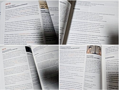 때론 우리 아기들을 위해 싫어하는 책을 곁에 두었다가, 때론 학교에 들어가는 딸을 위해 학습서를 읽다가, 때론 지쳐서 조용히 나를 위한 글을 읽었던 내가 세월이 흘러 나이가 들어가니 이젠 평생교육은 단어를 떠 올려본다. 특히 어학은 평생교육 중 꼭 유창해지고 싶은 파트 중 하나이다. 이 책 리딩 인싸이츠는 사회적 개념과 실용적 활용을 동시에 지향하는 고등학생, 대학생 및 성인을 대상으로 기획되었다. 한 각 장은 개념 설명, 현실 사례, 연습문제, 정답 해설 및 글쓰기 활용 예시로 법, 경제, 정치, 경제, 국제, 인공지능, 도시, 사회, 노동, 경영, 산업혁신, 국제경제, 국제정치, 심리, 미디어, 기술, 과학, 윤리, 철학 및 네트워크 이론 등 다양한 분야의 이야기를 unit 70으로 구성되어 있다.