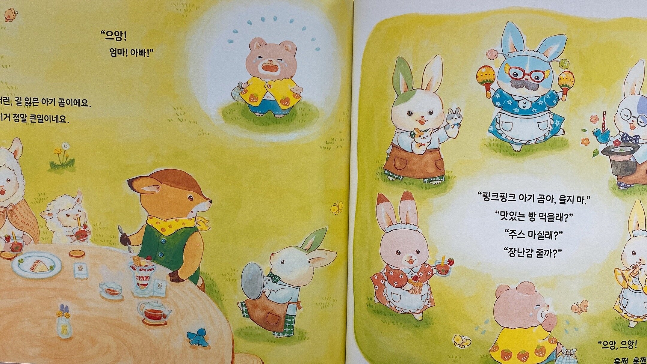 다섯마리 토끼는 곰돌이를 달래주러 하지만 여전히 울기만 하죠.