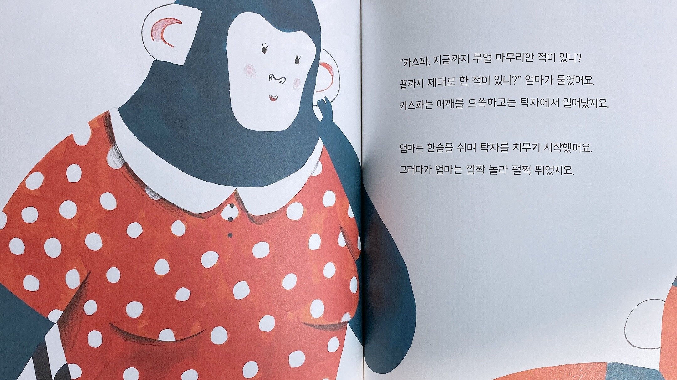 엄마는 식탁을 치우다가 깜짝 놀라고 말아요.