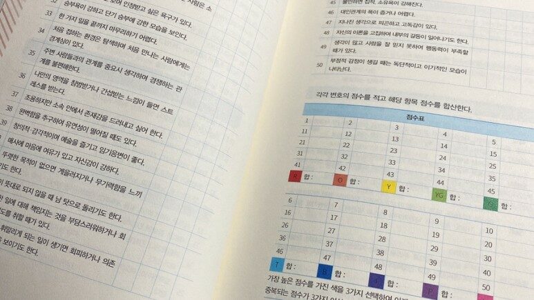 50가지 문항을 하나하나 체크해보면서 자신의 색을 찾아갈수있어요.