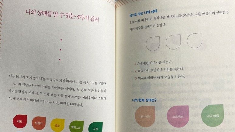 어렸을때 심리테스트, 색깔 테스트를 친구들과 재미삼아 하곤 했었는데, 이 책을 읽으면서 전문가가 테스트를 보고 심리상담을 받고 있는듯한 기분이 들더라구요.