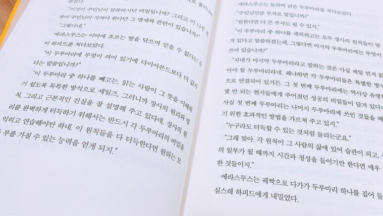 "이 두루마리 중 하나를 빼고는 읽는 사람이 그뜻을 이해하기 쉽도록 독특한 방식으로 세일즈, 그러니깐 장사의 원리와 법칙, 그리고 근본적인 진실을 잘 설명해 주고 있다네. 장사의 원리를 완벽하게 터드가기 위해서는 반드시 각 두루마리의 비밀을 익히고 연습해야만하네."