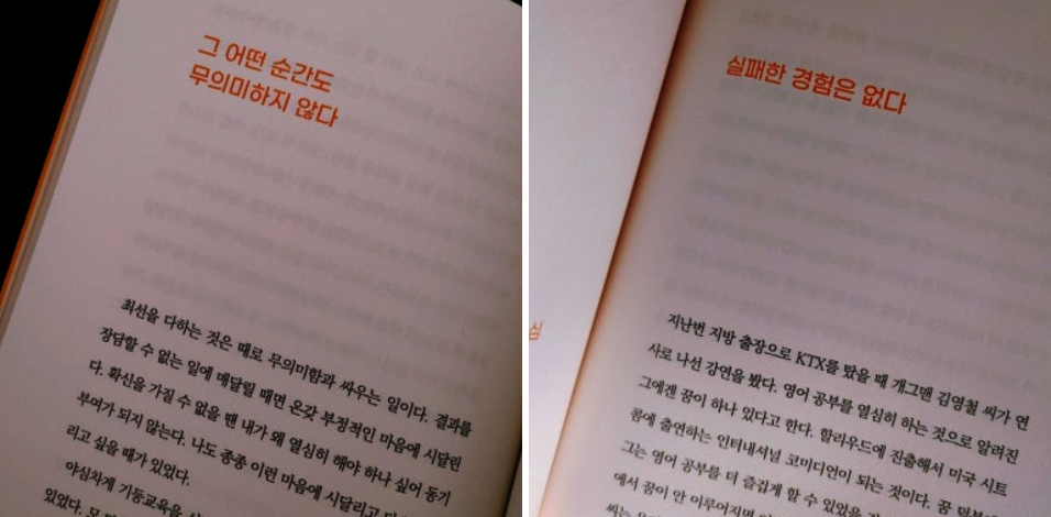 <실패의 달인이 전하는 진심>은 나 자신에 대한 도전이자 앞으로 더 나아갈 수 있게 힘을 준 책입니다. 현재의 모습이 반짝반짝 빛이 나는 사람은 다른 사람으로 하여금 선망의 대상이 되기도 하고 그로부터 배울 점을 찾아가게도 합니다. 이 책의 저자 엄기성님은 자칭 지잡대 출신으로 대기업 입사와 강사로서의 꿈을 활짝 펼치고 계신분입니다. 책장을 열고 서두에 마음에 확 와닿았던 부분은 시작점이 타고난 금수저, 있는 집 자식이 아닌 대다수의 사람들과 비슷하다는 점이었습니다. 타고난 배경 없이 성공가도를 달려가는 모습에서 희망을 읽을 수 있었고 열심히 살아가는 힘과 사람의 마음을 얻을 수 있는 노력들을 부단히 하셨던 점을 체크해놓고 실천가능한 것들부터 해보기로 다짐하기도 했습니다.