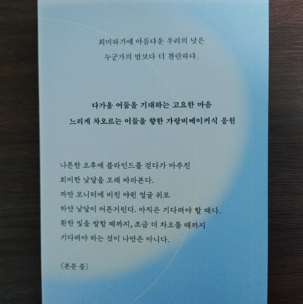 많은 생각이 스치는 글들이었고 정신을 차려보니 멍해있는 저 자신을 발견했던 아름다운 책이었습니다.