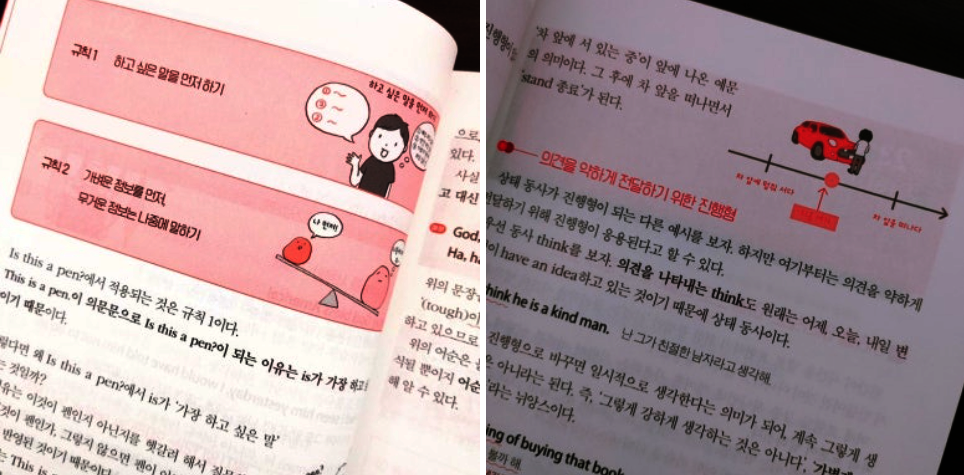 기존의 영문법 책에 나온대로 공부하면 간략한 설명과 예문, 설명으로 이해하고 바로 문제 풀이로 넘어가게 됩니다. 영문법 설명이 짧고 바로 문제로 이어지기 때문에 제대로 이해했는지도 모르게 단순 외우고 풀고의 반복이었던 것인데요. 시험용 영어 공부에 충실했던터라 맞는 선지를 골라내는 스킬을 배우는 공부에 가까웠던것 같습니다. 그러다보니 영문법 공부를 제대로 하지는 않은것 같아 아쉬웠었는데 이 책이 정말 빛이 되어주었습니다. 이해하기 쉽게 풀어쓴 설명은 물론 삽화가 적절하게 들어있고 부가 설명이 밑줄과 작은 글씨로 이루어진 점이 우등생의 비밀 노트를 훔쳐 보는 것 같은 느낌이 들게 했고 이 책을 읽는 것만으로도 그동안 잘못 알고 있었던 영문법을 바르게 교정하기 충분했습니다.