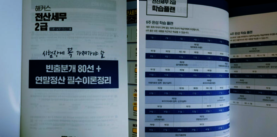 오로지 전산세무 2급 시험에만 몰입해서 공부할수 있다면 좋겠지만 공부해야 할 과목이 한둘이 아니기에 선택과 집중이 필요하다고 보고 전산세무 2급은 교재에 나온대로 최소 6주 완성을 목표로 잡고 알차게 한바퀴 돌리는 것으로 잡았습니다. 이론과 실무를 얼만큼 숙지했는가에 따라서 학습플랜은 2주, 4주, 6주 중 취사 선택하여 공부할 수 있고 최소한 6주 정도는 잡아둬야 이론과 실무에서 부족한 부분을 모두 채울 수 있을것 같아서 6주 완성으로 공부하는 것이 제일 무난하면서 효율적인 방법이 될것 같았습니다. 학습플랜대로만 공부하면 하루치의 적절한 공부분량이 할당되어 있기 때문에 공부할 의지만 있다면 시험 합격까지 무리없이 달릴 수 있을것 같습니다. 가장 처음 만나는 부록은 빈출분개 80선 + 연말정산 필수이론정리인데 시험일까지 매일 보고 공부해도 좋을 부록이라서 활용도가 높습니다.