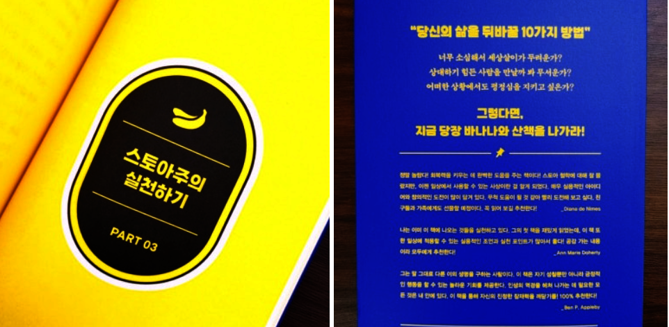 새로운 것에 대한 도전이 어려워 회피하거나 주저하는 편이신가요? 언제부터인지 정확하게 알 수는 없지만 마음이 다쳐 회복력 수업이 필요한 분들에게 적극 추천해주고 싶은 책을 만났습니다. <바나나 산책시키기>는 스토아 철학에서 힌트를 얻은 저자가 통제 불가능하다고 여겨졌던 것들을 통제가 가능하도록 용감하게 스스로 만든 틀을 깨고 부수는 연습을 했던 무수한 흔적들을 돌아보면서 스토아 철학의 실용적인 면모를 제대로 흡수해 모두가 더 나은 나로 발전할 수 있도록 실천가능한 것들을 소개해주는 실용서입니다. 저 역시 저자와 같이 철학을 전공하지 않은 비전공자임에 동질감을 느꼈고 스토아 철학이라는 것이 결코 어렵고 실용적이지 않은 두루뭉술한 학문이 아님에 마음을 열어가면서 나도 한번 따라해보자고 실천할 용기를 얻어갔습니다.