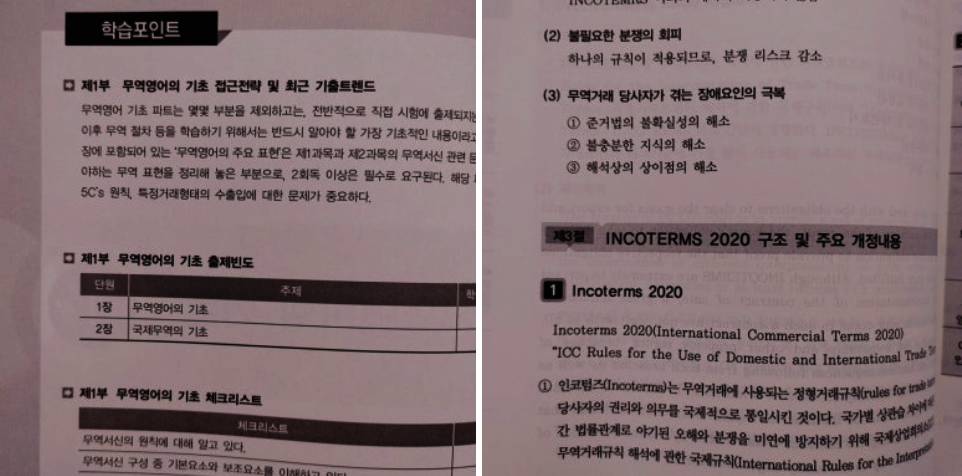 무역영어 영문해석, 영작문, 무역실무 파트 점수를 골고루 올리도록 책에 나와있는 영역별 학습포인트를 집중해서 체크한 후 공부를 해나갔습니다. 주제별 학습 중요도가 체크되어 있는 점과 출제 비율이 나오는 것이 단번에 중요도 파악에 도움이 많이 되었고 무역영어 기초 체크리스트 또한 유용한 길잡이였습니다. 무엇보다도 기대하고 있었던 인코텀즈 2020 공부에서도 원문과 번역본이 함께 잘 나와있어서 기존에 공부했던 내용에서 어떤 내용이 변화되었는지 파악하기 편했습니다. 신용장과 선하증권에 대한 공부도 다시 확인해보면서 무역 전공자가 아니더라도 쉽게 이해할 수 있을 정도로 개념 이해가 빠르게 될 교재인 점을 알게되었습니다. 이론 정리를 완벽하게 끝내고 기출문제를 풀 수 있도록 설계된 교재의 흐름이 좋았고 기출도 6회분이 수록되어 있어서 매유 유용했습니다. 영어 단어집과 CBT 온라인 모의고사를 무료로 이용할 수 있다는 점 또한 마음에 쏙 드는 구성이었습니다.