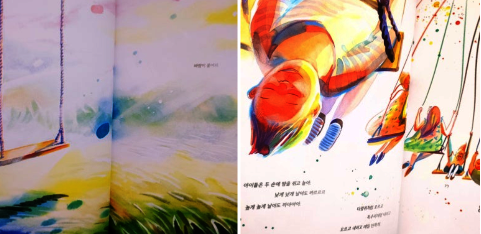 그네를 타고 친구들과 재미있게 놀았던 행복한 기억만이 가득한데 그림책 <이제, 날아오르자>에서 보여지는 그네는 어린 친구들의 꿈과 희망, 즐거움, 행복을 안고 비행합니다. 때로는 슬픈 날도 있고 외로운 날도, 울적한 날도 있지만 함께 하는 즐거움으로 새로운 변신을 하게 됩니다. 너무 가벼워도 그네를 재미있게 즐길 수 없고 여럿이서 함께 모여야 진정한 재미를 얻을 수 있습니다.